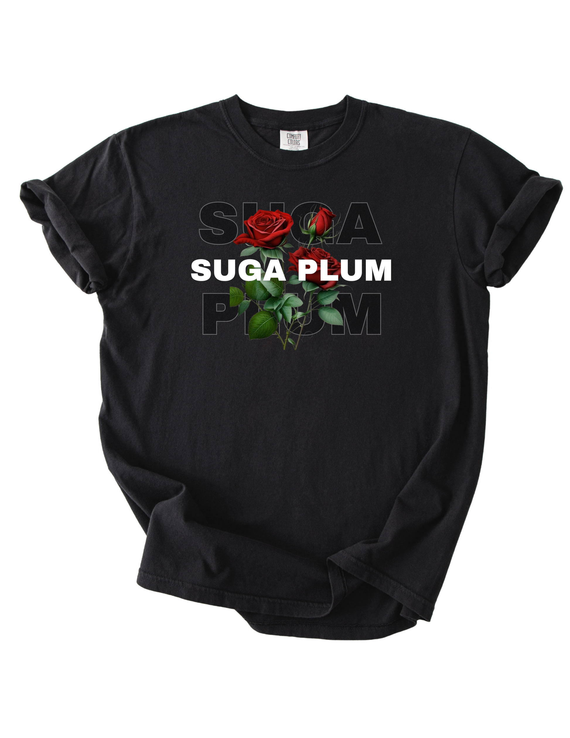 This custom made "Concrete Rose Suga Plum" black short sleeve 100% cotton T-Shirt has a design that represents beauty, strength, and inner determination.