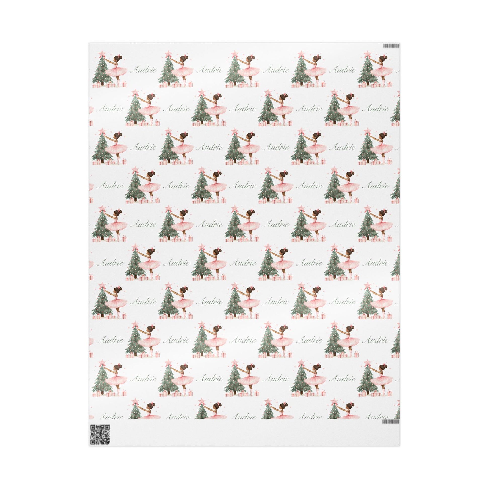 - Wrapping paper includes white spaces at top and bottom edges with a bar and QR code