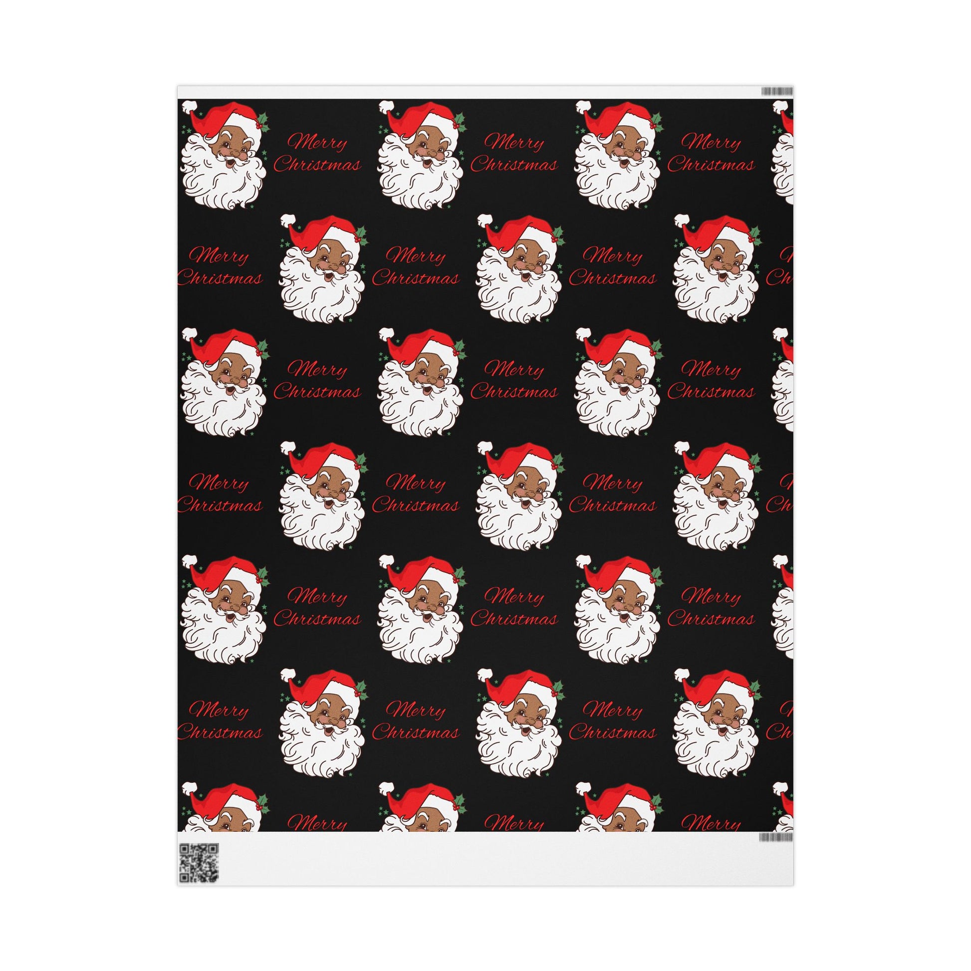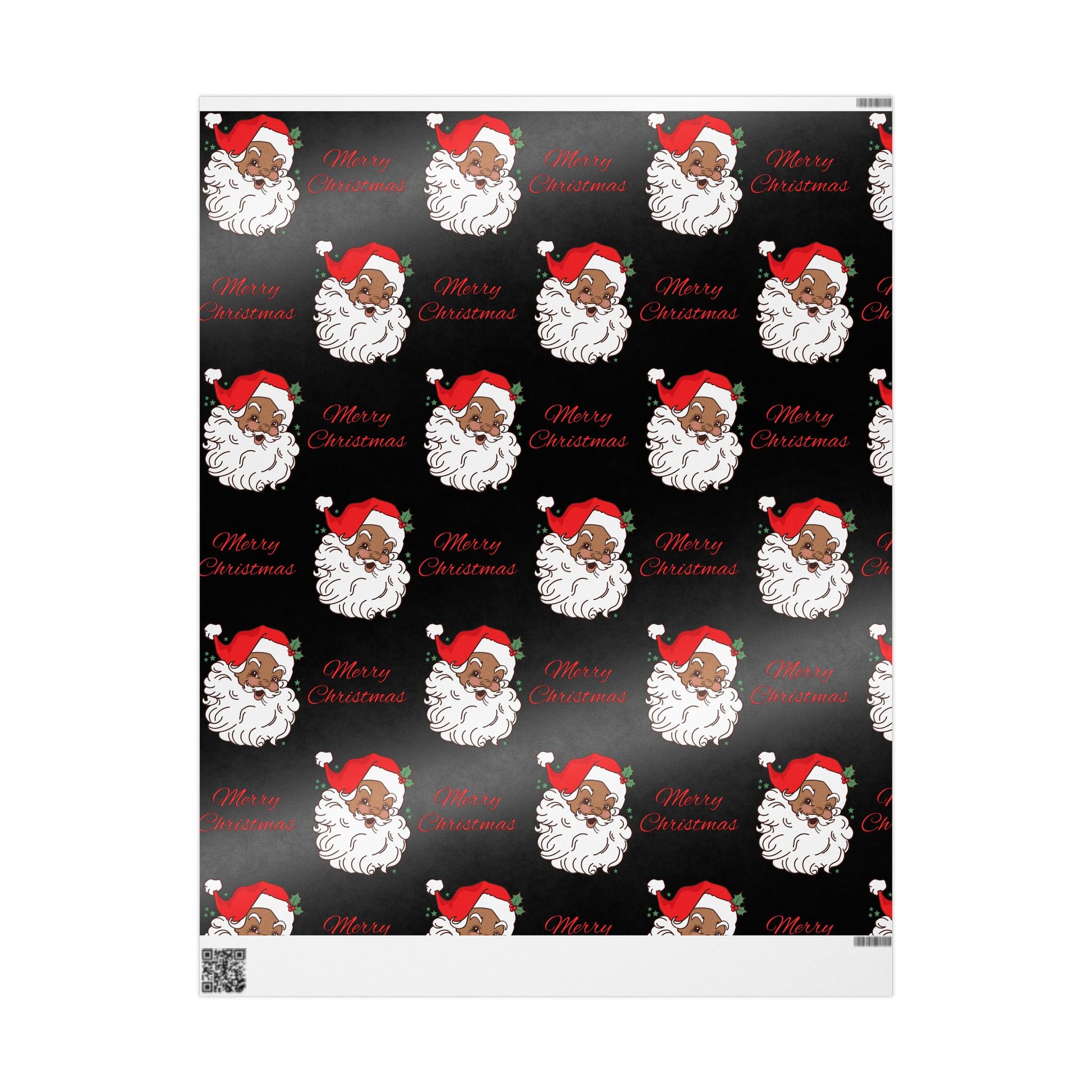 - Wrapping paper includes white spaces at top and bottom edges with a bar and QR code
